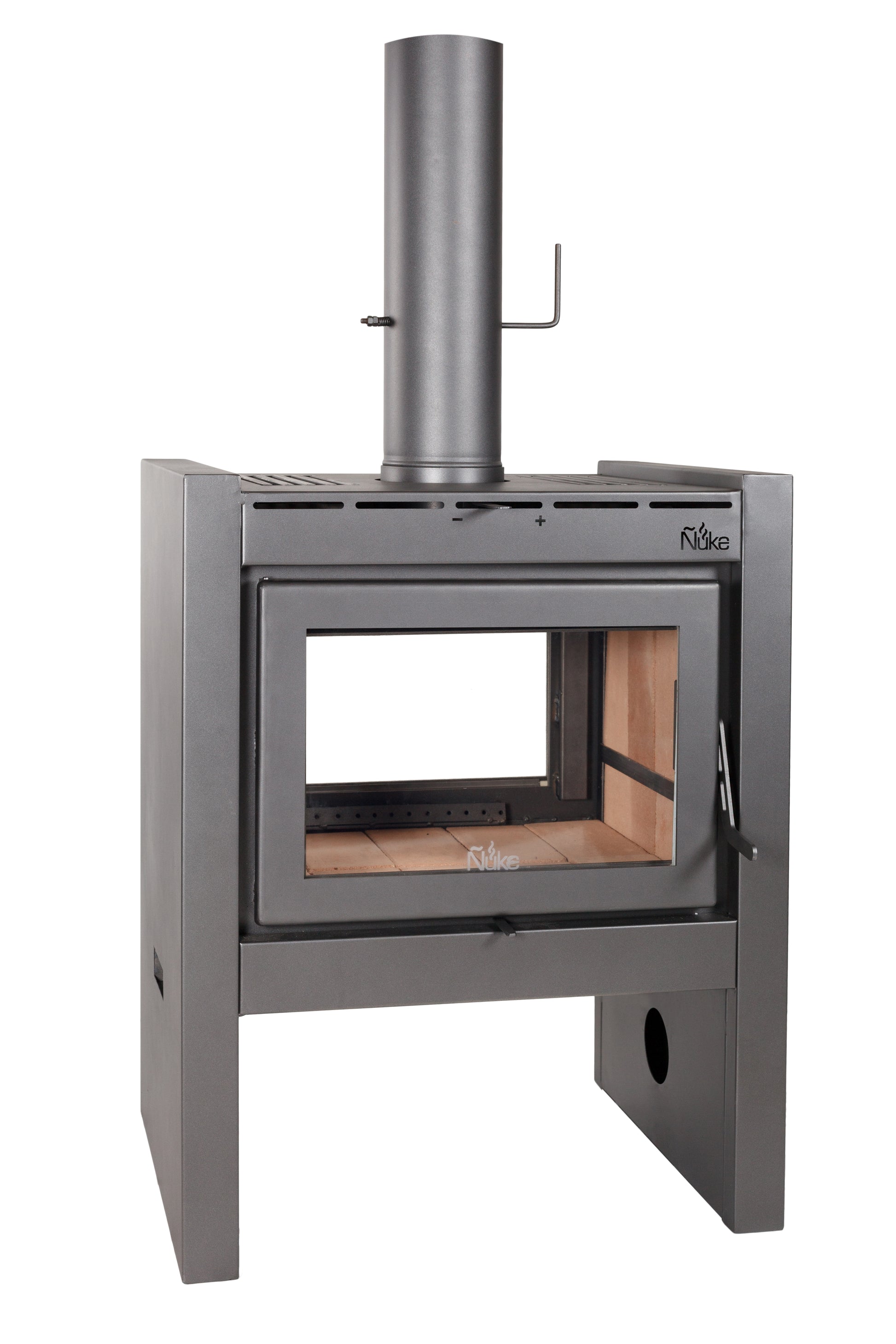Materiales | Acero de 5 mm de espesor en la zona de contacto con el fuego. Soldaduras MIG. Material refractario de 20 mm. de espesor. Vitrocerámica resistente hasta 750ºC. Pintura para altas temperaturas. |