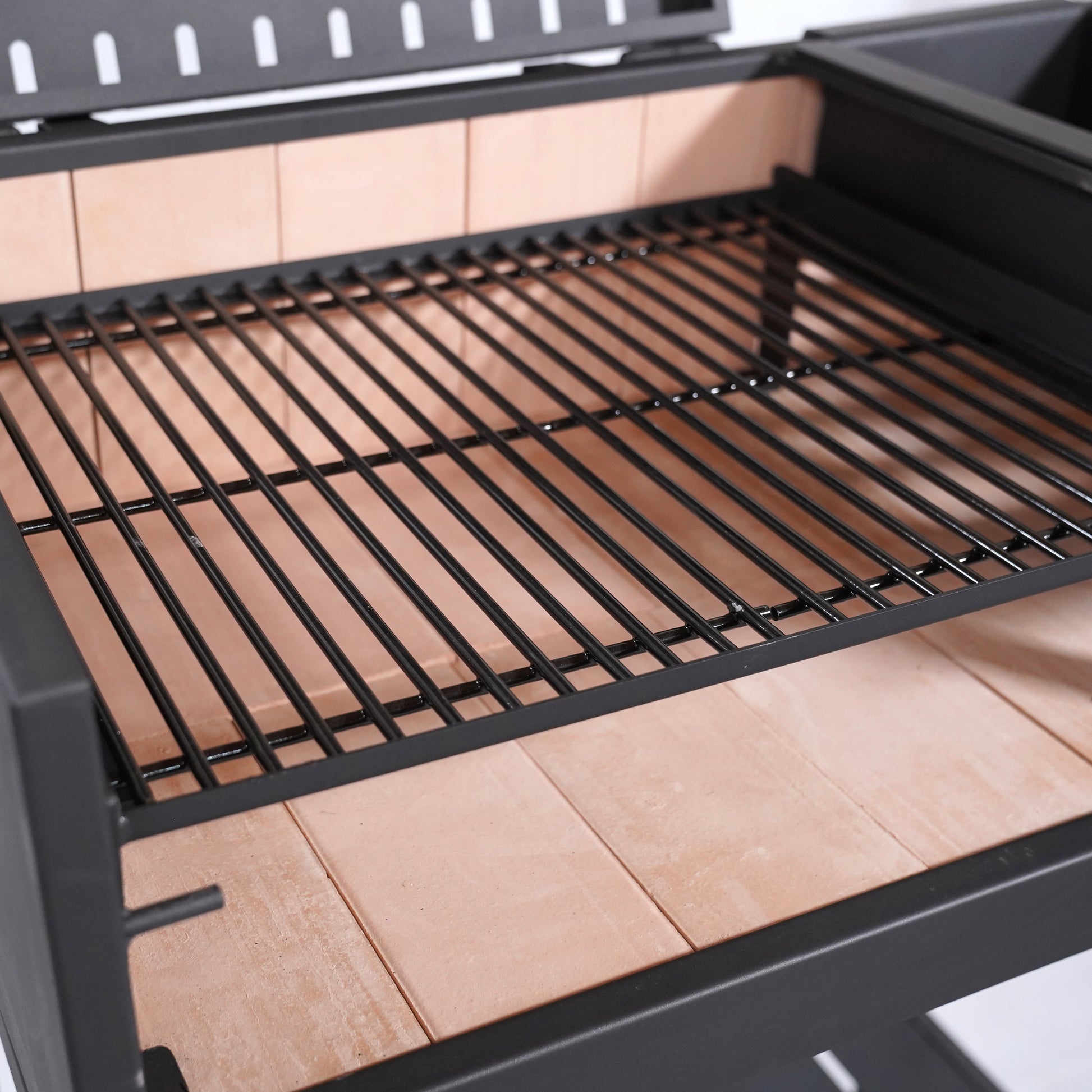 Diseño funcional: Incluye un brasero para encender carbón o leña de forma fácil y segura. Los hierros redondos enlozados aseguran un asado perfecto y un mantenimiento sencillo.